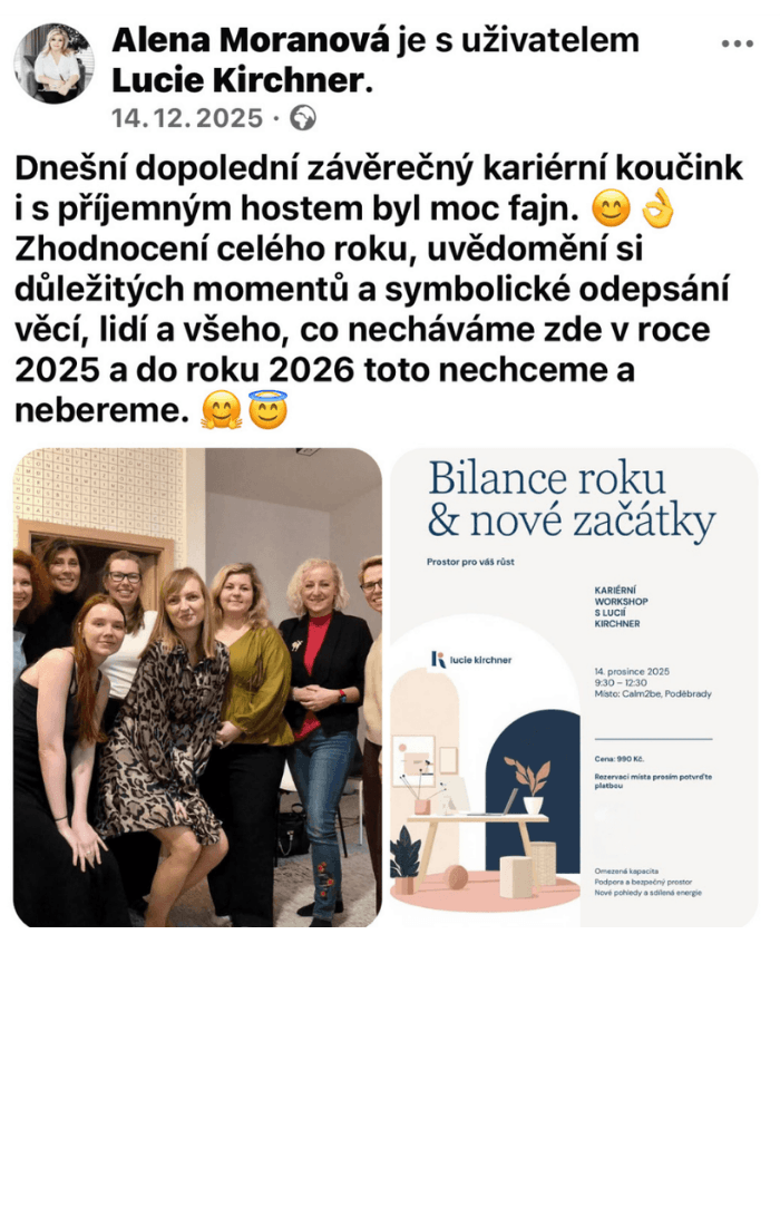 💡 Tip pro maximální efekt: Každý workshop je samostatný celek. Pokud ale chcete jít ještě hlouběji, doporučuji workshopy propojit s mými Lucie Kirchner - Online webináře 2026. Online probereme teorii, v Poděbradech to převedeme do praxe. Každý workshop je uzavřený celek.