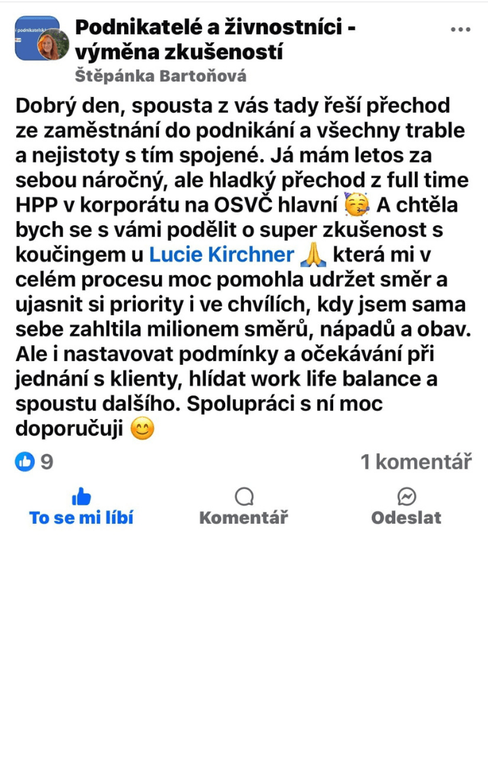 2 výcviky koučování (ICF, MŠMT) + certifikace peer konzultanta