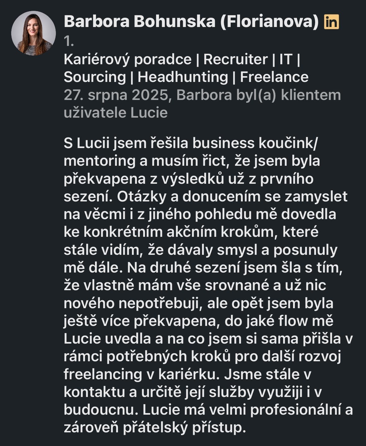 Zapomeňte na obecné rady. Získáte individuální strategii, která respektuje vaše hodnoty, a jistotu, že vaše práce má jak finanční, tak hluboký osobní smysl. Jednoduše: Kariéra & byznys, který funguje – a vy v něm máte prostor pro život.