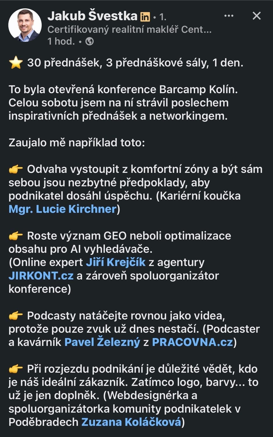 Místo, kde si účastníci navzájem předávají kontakty, zkušenosti a podporu.