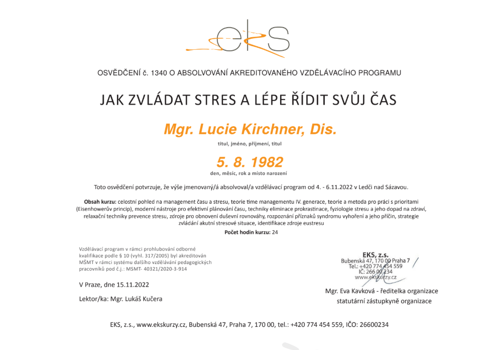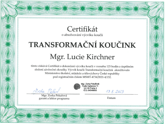 2 výcviky koučování (ICF, MŠMT) + certifikace peer konzultanta